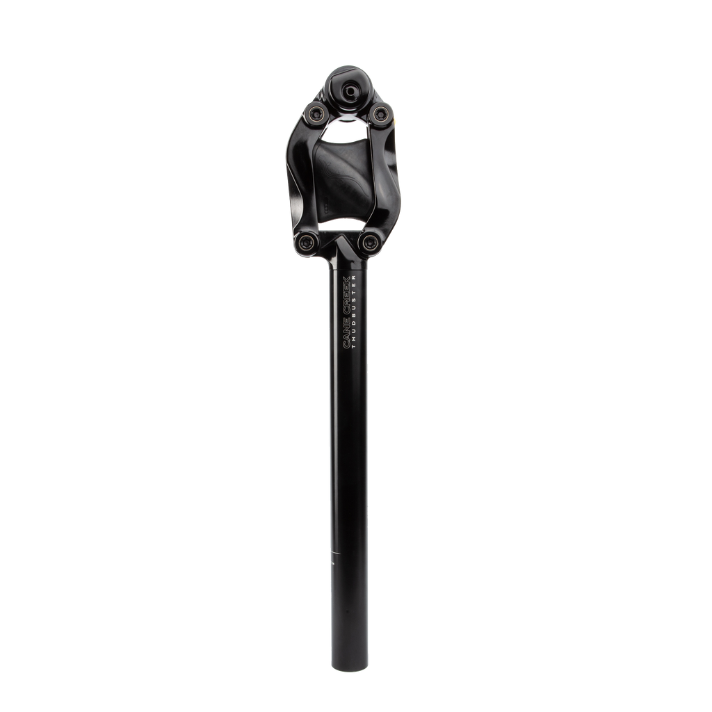 Cane Creek Thudbuster LT Suspension Seatpost - 27.2 x 390mm 90mm Black. Building on Thudbusters proven parallel linkage technology Cane Creek has completely re-designed the seatpost for increased durability a higher rider weight limit additional suspension travel as well as ease of use through tool-free elastomer change and a single-bolt seat clamp design. Designed specifically with the rigors of e-bikes and daily commuting in mind the Thudbuster LT (long travel) has 90mm of travel to significantly diminish shocks and impacts from broken pavement cobblestones or any other mixed surfaces.Forged aluminum post with 90mm of travel