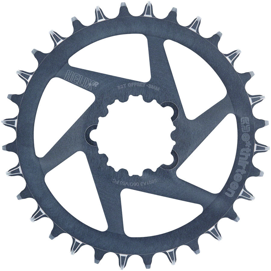 e*thirteen Helix R Guidering - 32t 11/12-Speed 3mm Offset SRAM 3-Bolt DM Gray. Helix R SRAM Direct Mount Chainrings offer a true upgrade solution for SRAM 3-Bolt MTB crank users (including DUB) to achieve cross compatibility with both SRAM™ and Shimano™ 11 and 12-speed drivetrains.Forged from 7075- T7 aluminum then extensively CNC optimized for industry leading weights and a unique high-end full CNC aesthetic