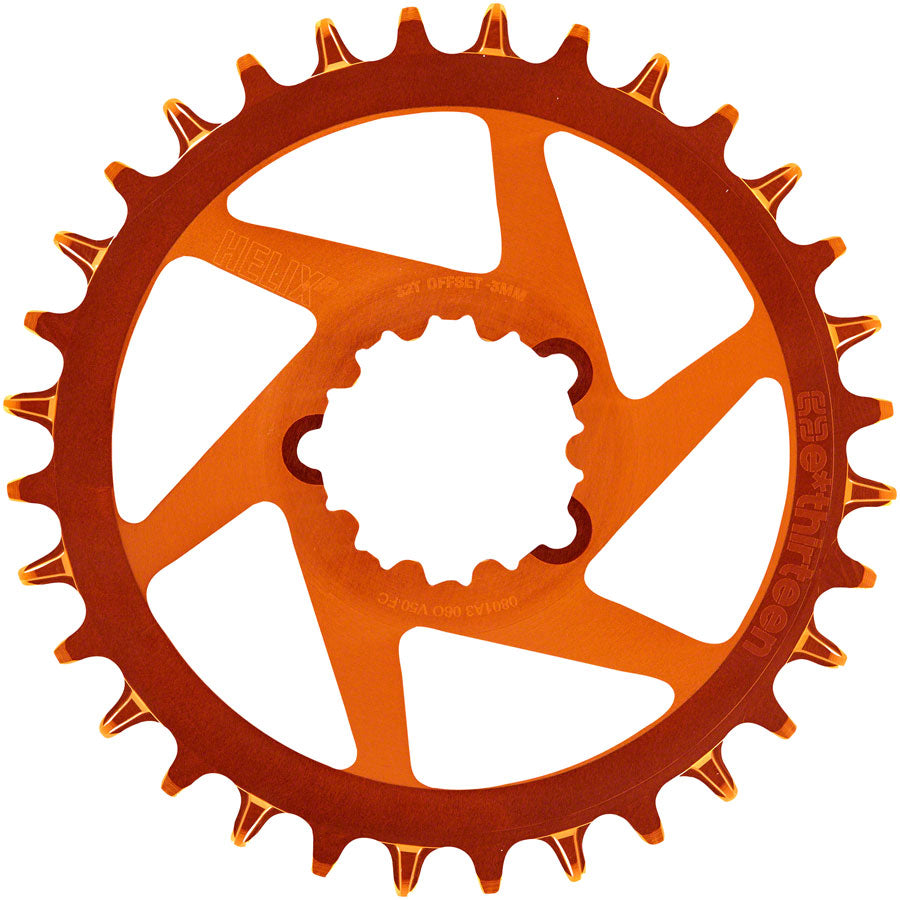 e*thirteen Helix R Guidering - 32t 11/12-Speed 3mm Offset SRAM 3-Bolt DM Naranja. Helix R SRAM Direct Mount Chainrings offer a true upgrade solution for SRAM 3-Bolt MTB crank users (including DUB) to achieve cross compatibility with both SRAM™ and Shimano™ 11 and 12-speed drivetrains.Forged from 7075- T7 aluminum then extensively CNC optimized for industry leading weights and a unique high-end full CNC aesthetic