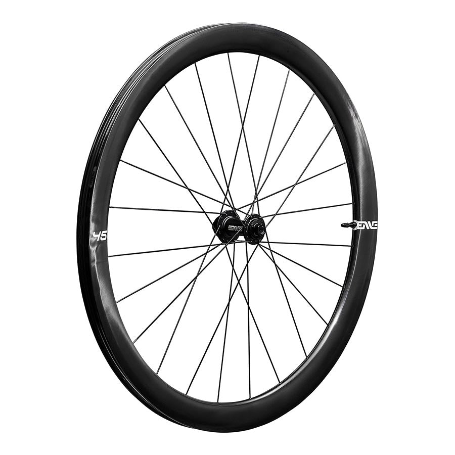 ENVE Composites 45 Foundation Front Wheel - 700 12 x 100 Center-Lock Black. The 45 Foundation is a modern carbon road wheel in every way. Riders with inclinations toward racing and hard solo efforts or those looking for the road lost and forgotten will find the dynamic properties the modern road rider needs. Built upon over a decade of carbon wheel crafting experience the 45 brings Enves knowledge and technology to the masses. Blended aero properties tubeless compatibility and pinch flat protection for the rider looking to test the waters on carbon wheel performance.Full carbon rim is optimized to further improve tubeless tire and rim reliability with a hookless bead design that allows for the precise rim dimensions required to achieve the best tubeless performance