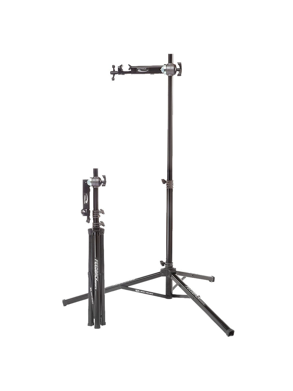 Feedback Sports Sport Mechanic Bike Repair Stand. The Sport Mechanic Bike Repair Stand prioritizes the most critical aspects of the entire Feedback Sports bike repair stand lineup – compatibility stability durability and portability. The 360-degree rotating clamp uses a spinner knob closure that can accommodate up to 1.9″ (4.8cm) and support 65lbs (29.5kg). Plus the Sport Mechanic leverages the same 54″ (137cm) wide base with rubber-coated end caps for amazing stability on any surface. And when the service day is done it folds in to a compact unit for storage or travel.Clamp features Spinner Knob for precision closure and uniform clamping pressure