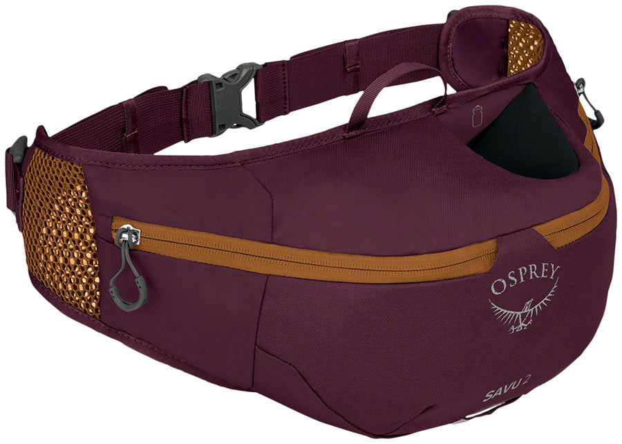 Osprey Savu 2 Lumbar Pack - One Size Aprium Purple. Savu 2 Lumbar Pack. Reach for this single-bottle lumbar pack for quick laps on your favorite trails. Offering enough storage capacity for ride essentials such as a spare tube CO2 multi-tool and snacks. Constructed with high-quality bluesign®-approved recycled high-tenacity nylon with a PFC-free DWR coating.Extra thick ridged foam with center air channel for excellent ventilation