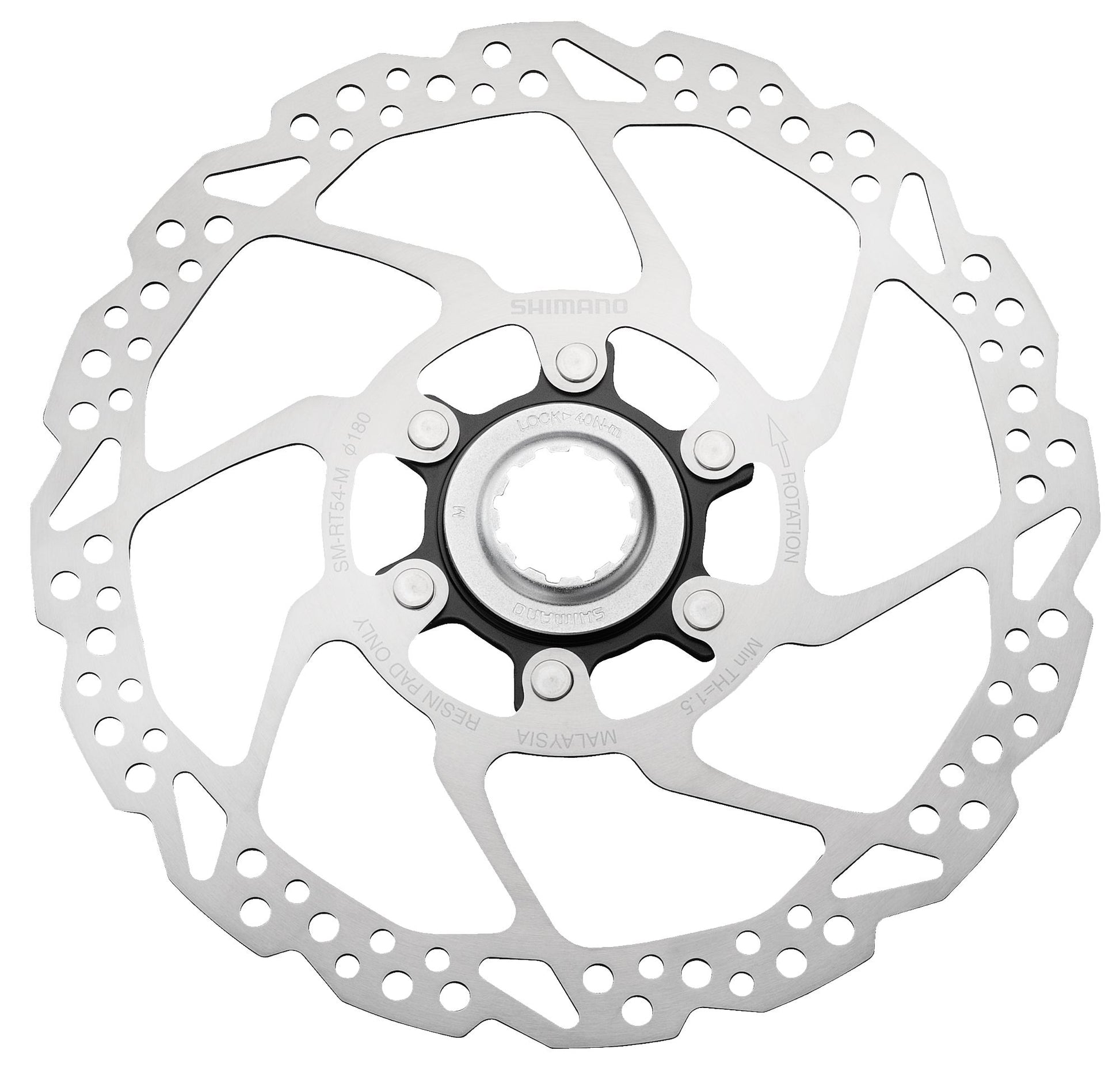 Shimano Deore SM-RT54-M Disc Brake Rotor - 180mm Center Lock For Resin Pads Only Silver. The Shimano Deore SM-RT54 disc brake rotors provide exceptional stopping power in all riding conditions. Shimanos Center Lock mounting system makes installing and removing rotors quick and easy thanks to the spine mount and lock ring design.For use with resin pads only
