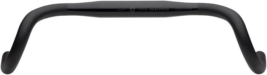 Salsa Cowchipper Deluxe Drop Handlebar - Aluminum 31.8mm 38cm Black. Cowchipper provides comfort control and efficiency for long days in the saddle whether road touring crushing mixed surfaces or conquering the Great Divide. While the Cowchipper retains some resemblance of a traditional road bar its radical 24 degree flare in the drops boosts leverage stability and comfort dramatically.Lightweight and strong 7050-T76 series alloy construction with polished finish