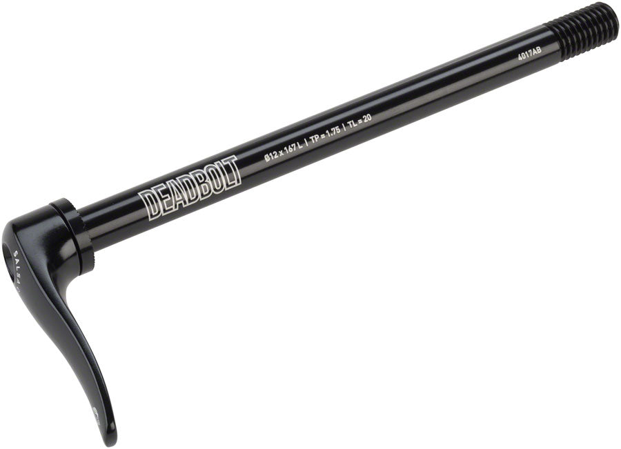 Salsa Deadbolt Thru-Axle Rear 12mm Axle Diameter 167mm Length 1.75 Thread Pitch 20mm Thread Length. The Deadbolt Thru-Axles feature the classic-looking Salsa lever and can be adjusted to return to the desired position when properly tightened. Lightweight easy to use and secure.CNC-machined from 7000 series aluminum