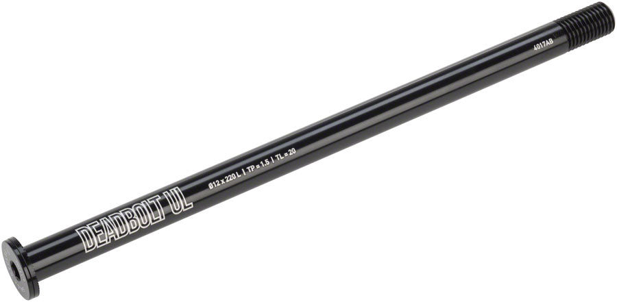 Salsa Deadbolt Ultralight Thru-Axle Rear 12mm Axle Diameter 220mm Length 1.5 Thread Pitch 20mm Thread Length. The Deadbolt Ultralight Thru-Axles are offered in a 6mm flat button head design for a flush clean look. Lightweight easy to use and secure.CNC-machined from 7000 series aluminum