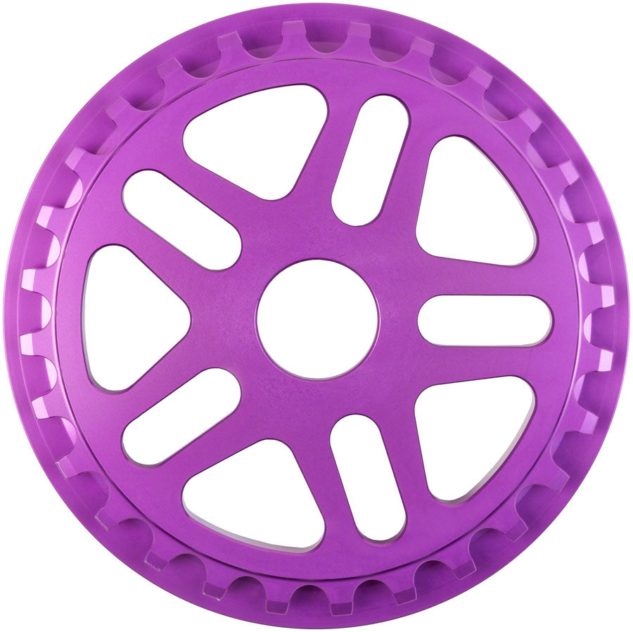 Sunday Knox V2 Sprocket - 28t Anodized Purple. The Sunday Knox V2 guard sprocket made of 7075-T6 aluminum. Featuring refined machining geometry for a sleeker look and designed to work with and protect all chains from unwanted impact.Full guard on one side of the sprocket with 5 rotatable sprocket bolt hole positions
