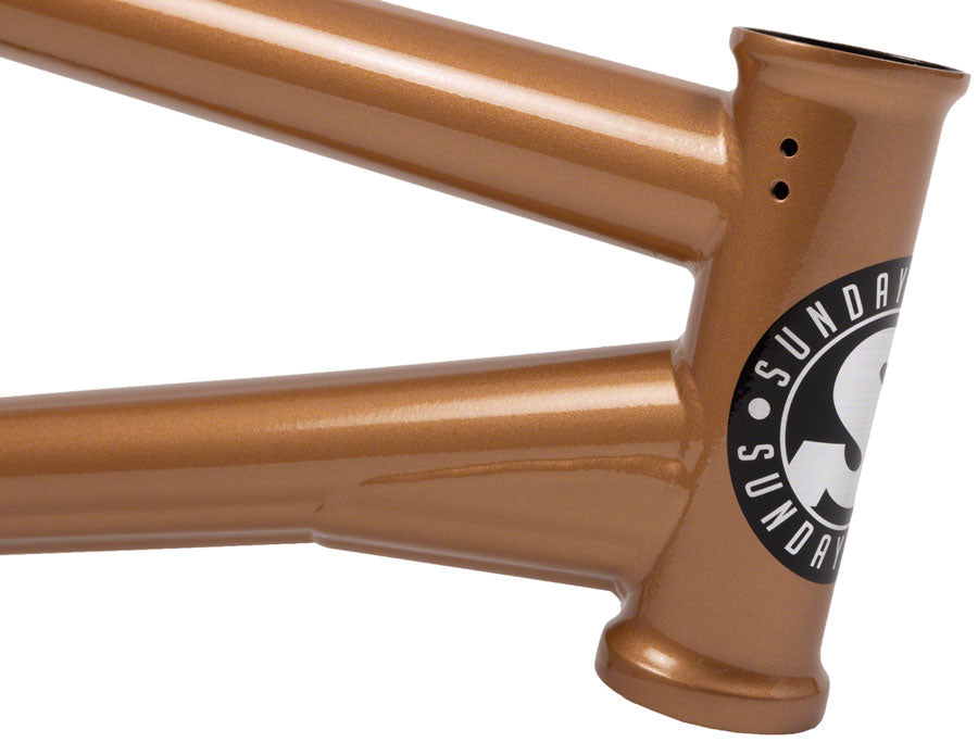 Sunday Silvawave BMX Frame - 21.25" TT Amber. Brett Silva known for his upbeat energy impressive video parts and winning Silver at X Games Real BMX Best Trick now has the chance to design his own frame: the Silvawave. This 100% 4130 chromoly frame features Sunday’s signature dent-resistant wave down tube integrated seat clamp tapered stays removable brake hardware hollow dropouts and integrated chain tensioners. The geometry includes a stable 75° head tube angle a longer 13.45-13.70” chainstay and a tall 9.5” standover providing a confident ride-feel at speed. The Silvawave is an affordable and versatile signature frame designed to handle intense riding styles.100% 4130 chromoly frame