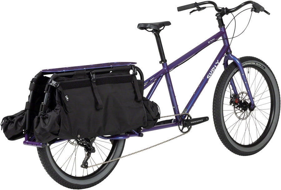 Surly Big Dummy Cargo Bike - 26" Steel Bruised Ego Purple Large. The Surly Big Dummy. Designed to transport a rider and up to 200 pounds of cargo the Big Dummy retains an extremely smooth and maneuverable ride under the heaviest of burdens. Big Dummy bikes ship with a Dummy deck rails Dummy Rail Collars bags and kickstand.100% Surly chromoly steel; fork is suspension corrected for 80mm