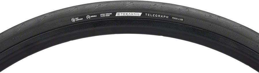 Teravail Telegraph Tire - 700 x 28 Tubeless Folding Black Durable. Telegraph is a high-volume performance road tire. It offers all the grip and rolling speed of lower-volume road tires with the comfortable ride of a larger 120 tpi casing. Telegraph’s tread pattern features a slick center tread for carrying speed and a textured transition area for cornering grip. Telegraph is made for anyone who wants to elevate the road riding experience.Designed and inspired by our experiences riding and racing on pavement