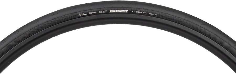 Teravail Telegraph Tire - 700 x 30 Tubeless Folding Black Durable. Telegraph is a high-volume performance road tire. It offers all the grip and rolling speed of lower-volume road tires with the comfortable ride of a larger 120 tpi casing. Telegraph’s tread pattern features a slick center tread for carrying speed and a textured transition area for cornering grip. Telegraph is made for anyone who wants to elevate the road riding experience.Designed and inspired by our experiences riding and racing on pavement