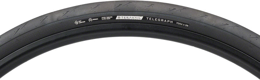 Teravail Telegraph Tire - 700 x 35 Tubeless Folding Black Durable. Telegraph is a high-volume performance road tire. It offers all the grip and rolling speed of lower-volume road tires with the comfortable ride of a larger 120 tpi casing. Telegraph’s tread pattern features a slick center tread for carrying speed and a textured transition area for cornering grip. Telegraph is made for anyone who wants to elevate the road riding experience.Designed and inspired by our experiences riding and racing on pavement