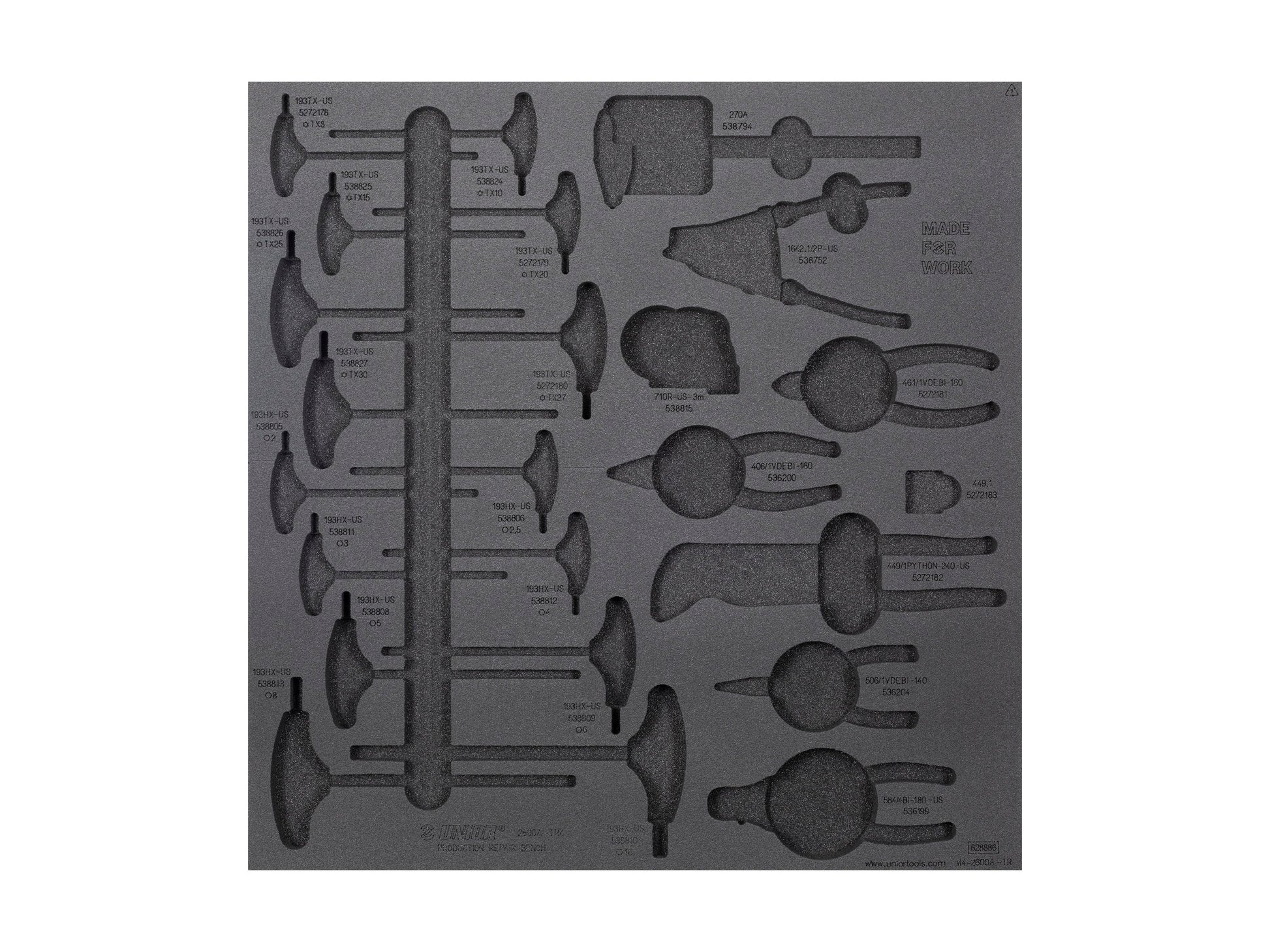 - Foam insert dimensions are 22" (559mm) wide, 22.4" (569mm) deep, and 1.25" (32mm) tall