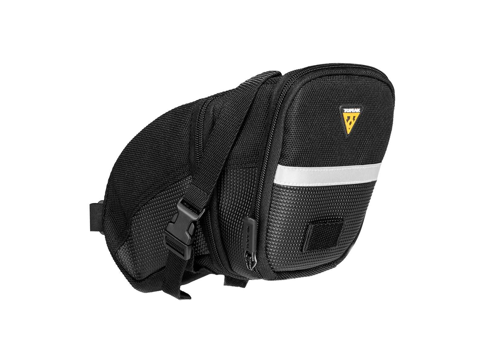 Topeak Aero Wedge Seat Bag - Strap-on Large Black. The aerodynamic wedge shape lets these under seat bags slip easily through the wind while the internal pockets keep tools away from inner tubes and other delicate items.Weather resistant covered zippers keep contents dry